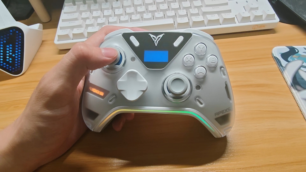 这款手柄在握感取向上偏舒适路线,机身弧度自然,连续操作时不容易产生明显疲劳感。外观提供多种配色选择,整体不张扬。摇杆采用TMR结构后,中段控制更连贯,回中稳定,细小角度的准星修正比较好掌控,但默认阻尼设定偏轻,手感偏灵敏。双模式扳机在不同游戏中能体现出清晰差异,背部四键支持独立编程,对需要频繁连段或功能切换的游戏比较友好。RGB灯效可玩性高,不过在暗环境下存在亮度偏强的问题。
