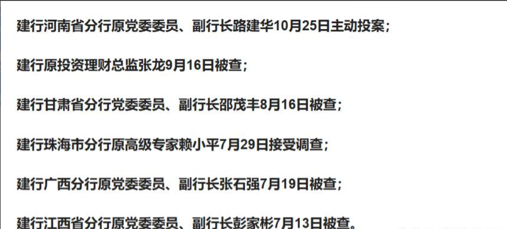 倒是今年4月中央第九巡视组进驻建设银行,开展为期3个月的巡视工作,落马的中高级管理人员可以列出一串长长的名单,总行原副行长章更生在巡视后落马(11月8日)。