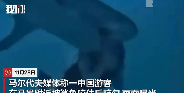 画面显示一名40多岁女游客在马累附近被鲨鱼突然咬住头后脑勺,随后游客挣扎着逃走,在鲨鱼松嘴巴时女游客赶紧趁机游泳回水面。