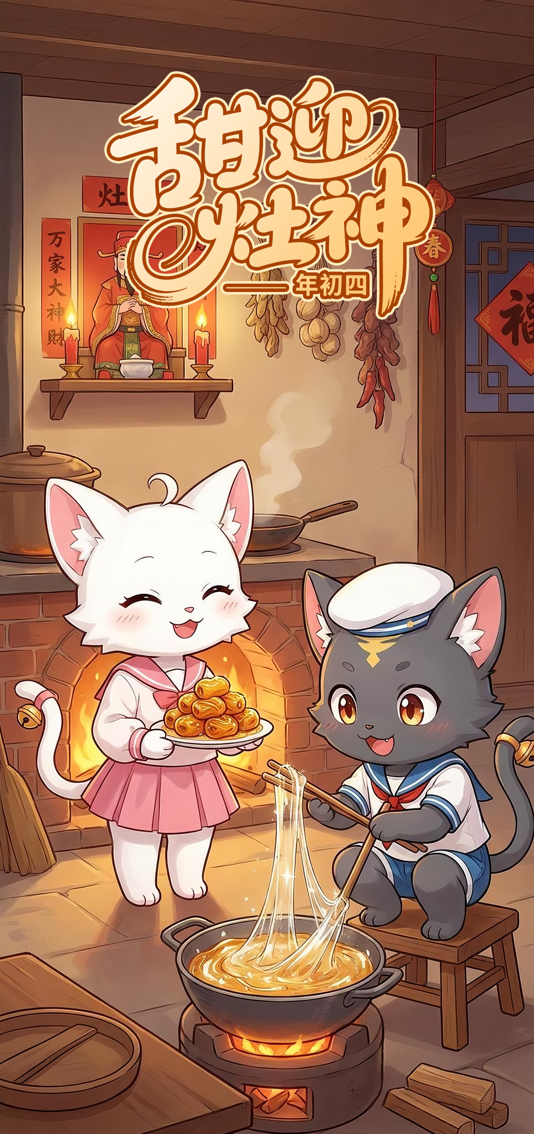 初四接灶神,把甜意和福气都迎进门!黑猫玄墨蹲坐矮凳,专注搅动麦芽糖,晶莹糖丝拉满童趣,祝大家祈福开运,灶火常旺万事顺遂。白猫绵雅捧起金丝蜜枣,笑意温婉恭敬祈福,愿你人缘爆棚,阖家和暖聚满福气。灶神归位,日子甜甜,好运连连!