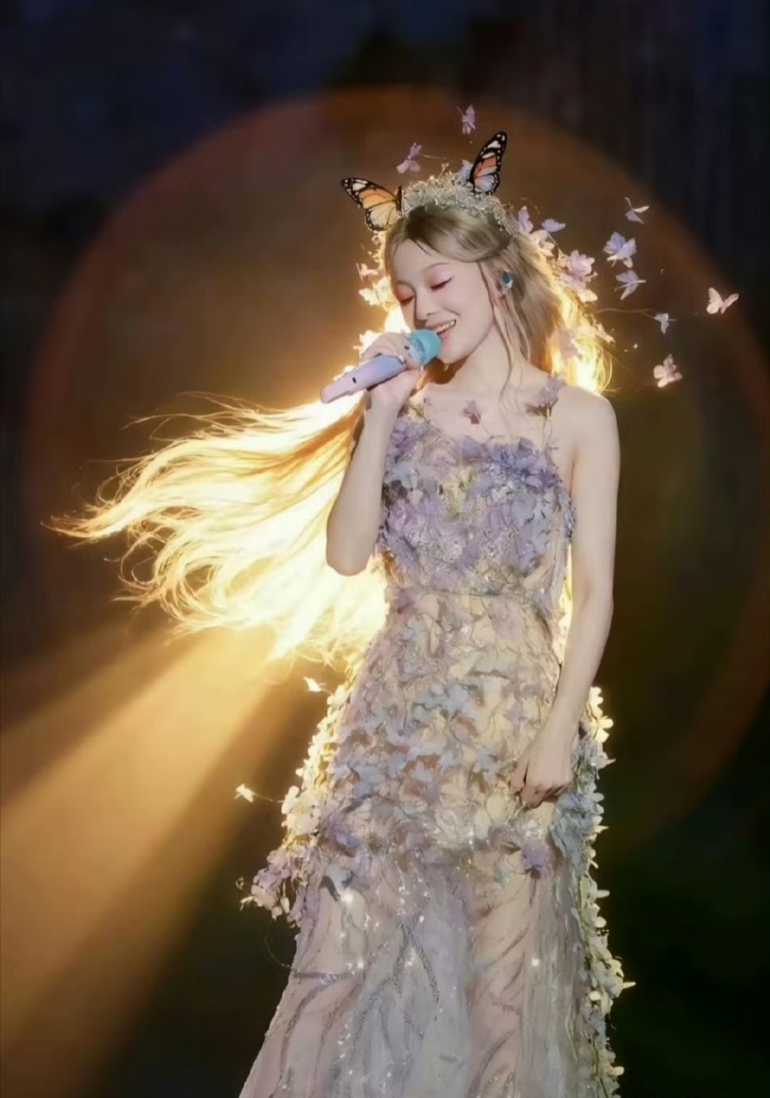 帕克团队曾是张韶涵舞台形象的“灵魂画手”。从《歌手》时期的高定机械姬战袍,到巡演中“水精灵”“火凤凰”等主题造型,帕克以科技感面料、精准的身材比例剪裁,将张韶涵158cm的娇小身材塑造出“空灵与力量并存”的视觉奇观。例如,南京场“花仙子”造型采用渐变薰衣草紫纱裙,头戴手工花环,配合裸眼3D羽翼舞台,被《VOGUE》评价为“重新定义音乐演出视觉范式”。然而,汕头站新团队却以厚重卷发、夸张装饰彻底颠覆这一美学体系,蓝色亮片长裙在灯光下绷出褶皱,羽毛头饰被嘲“愤怒的小鸟”,网友直呼:“从神话神女秒变商演嘉宾!”