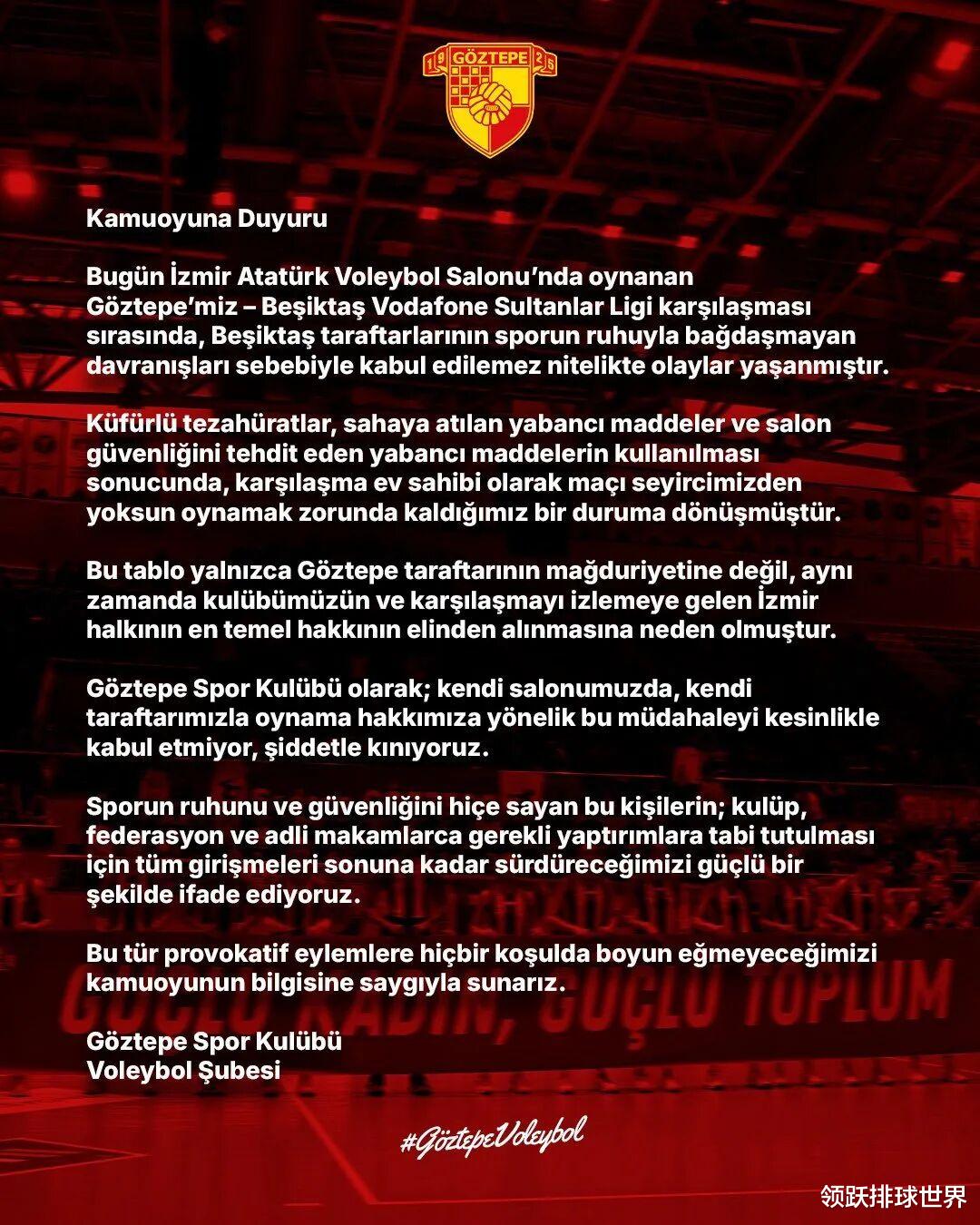 戈兹特佩女排俱乐部在赛后第一时间发布了一份措辞强硬的“致公众声明”,痛斥本场比赛发生的种种不当行为。