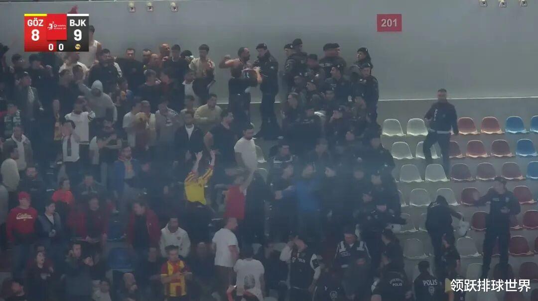 根据现场画面显示,客队队长多次面向看台,试图平息本队球迷情绪,而戈兹特佩女排队长也在对主场球迷发出理性呼吁,然而,一些极端分子无视警告,继续爆粗、扔瓶、踩座,引发两派球迷肢体冲突。