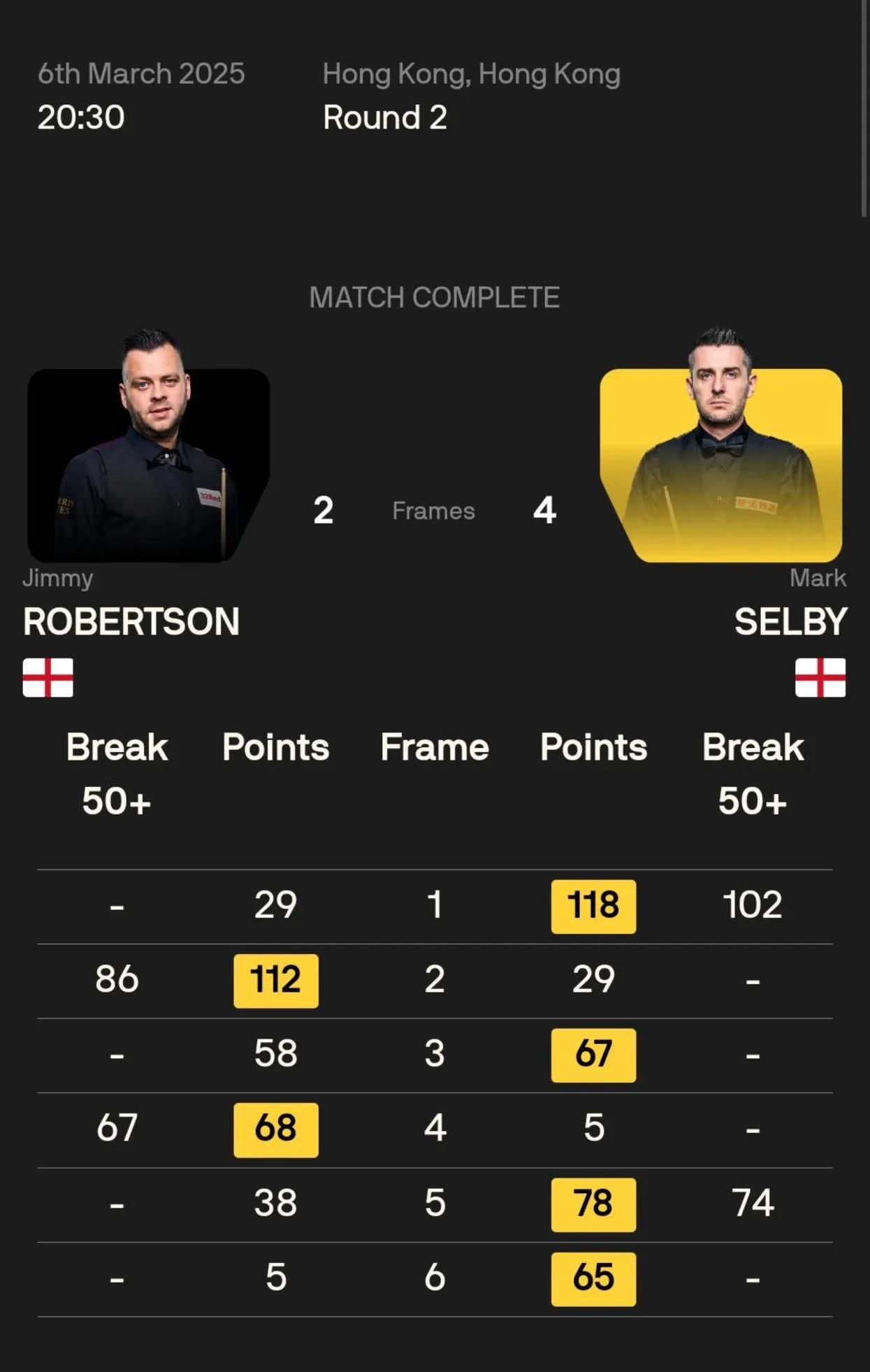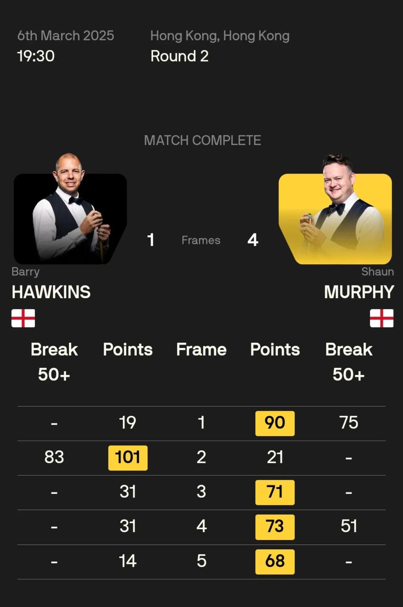 虽然霍金斯顽强反击,打出了单杆83分,扳平比分,但墨菲随后打出单杆51分,连胜三局,最终以4-1战胜对手,顺利晋级八强。