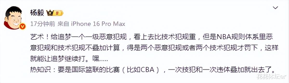 篮球名嘴杨毅在社媒普及知识:艺术!给追梦一个一级恶意犯规,看上去比技术犯规重,但是NBA规则体系里恶意犯规和技术犯规不叠加计算,得是两个恶意犯规或者两个技术犯规才罚下,这样就能让追梦继续打。不得不说,格林没有被罚下,裁判组立功了。