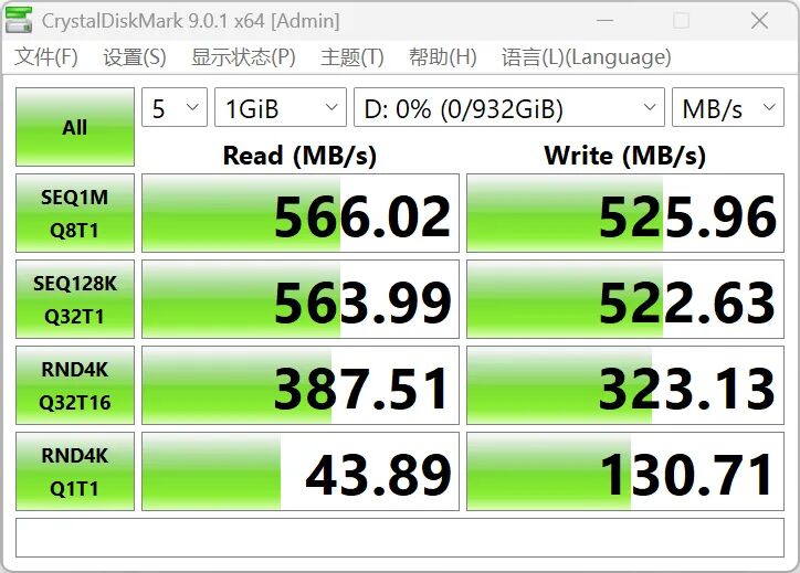 从测试结果来看,致态小翼S001固态硬盘1TB完全达到了标称性能水平。它的顺序读写速度分别可以达到566.02MB/s、525.96MB/s,其读取速度已经接近SATA Ⅲ接口的理论传输带宽上限600MB/s,同时测试成绩还小幅超越顺序读取550MB/s、顺序写入500MB/s的标称规格。再来看随机性能,其在随机4KQ32T16的读写速度分别为387.51MB/s、323.13MB/s。换算过来它的随机读写IOPS分别为95K IOPS、79K IOPS,其随机读取与随机写入性能均明显超越标称规格。同时在AS SSD Benchmark测试中,致态小翼S001固态硬盘1TB也获得了907分的总成绩,在SATA产品中性能位居中上水准。