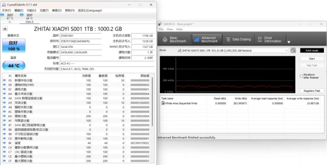 完成1TB数据写入后,致态小翼S001固态硬盘1TB的工作温度仅44℃。