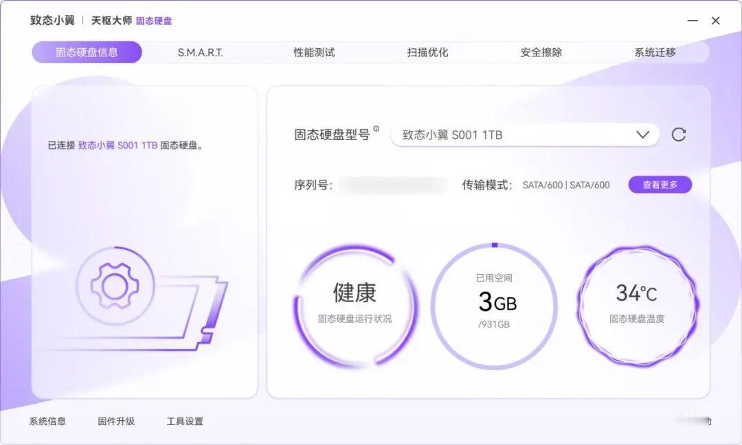 同样,致态小翼S001固态硬盘的用户也可以下载、安装免费的天枢大师工具软件对固态硬盘进行维护。该软件的设计界面与产品包装类似,也是以紫色羽翼为背景,给人轻松、活泼的观感。该软件不仅可以清晰地显示固态硬盘的健康状态、可用空间与工作温度,让用户对固态硬盘的工作状态了如指掌。天枢大师还能对固态硬盘的固件进行升级,并拥有将固态硬盘性能恢复到出厂状态的安全擦除功能。该功能对用户来说非常实用,很多固态硬盘需要用户自制USB启动盘才能执行安全擦除功能,相当麻烦。而天枢大师的安全擦除功能可在Windows操作系统下运行,用户只需通过简单地点击按钮,就能让固态硬盘在最佳性能状态下工作,非常方便。