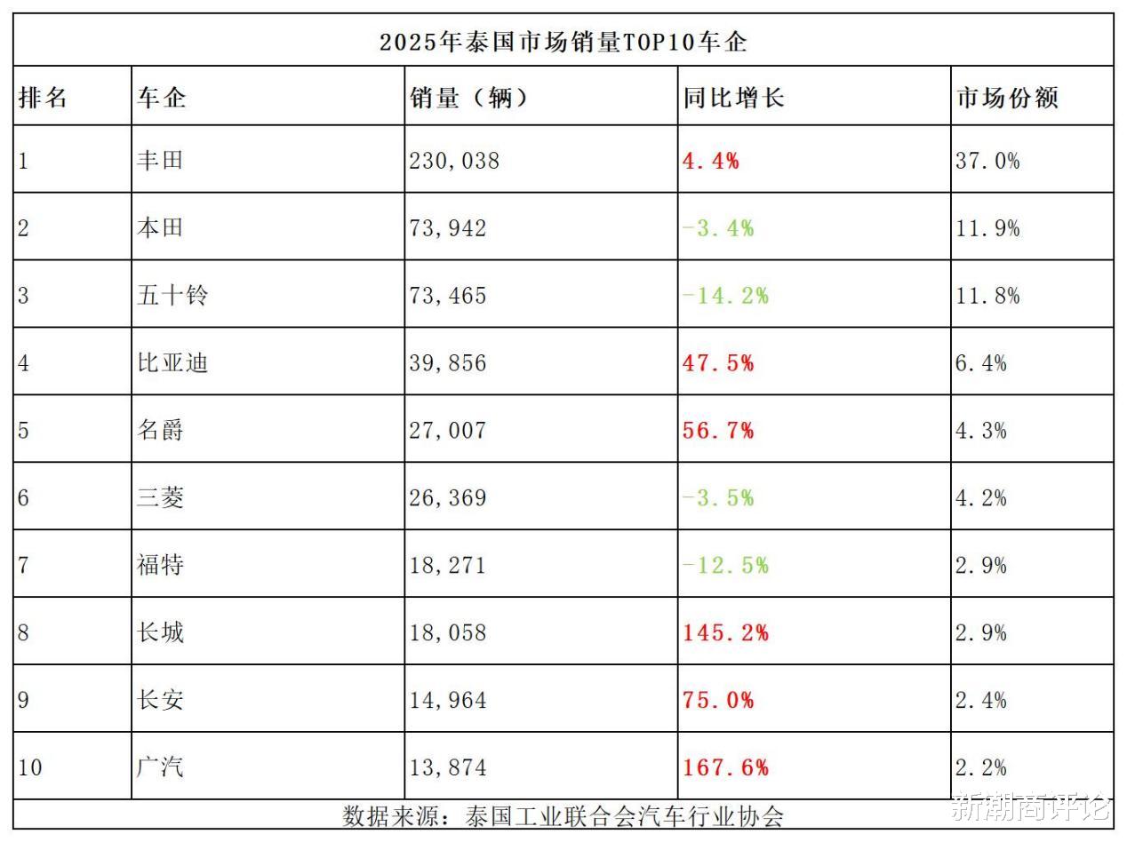 在泰国车市销量前10车企中,中国企业占据半壁江山。2025年比亚迪在泰国本土市场的注册销量为39,856辆,同比增长47.5%,市场份额 6.4%,位列泰国乘用车市场第四。【注:比亚迪官方披露的 “2025年在泰注册登记车辆44,636辆”,包含腾势(Denza)等子品牌的销量】