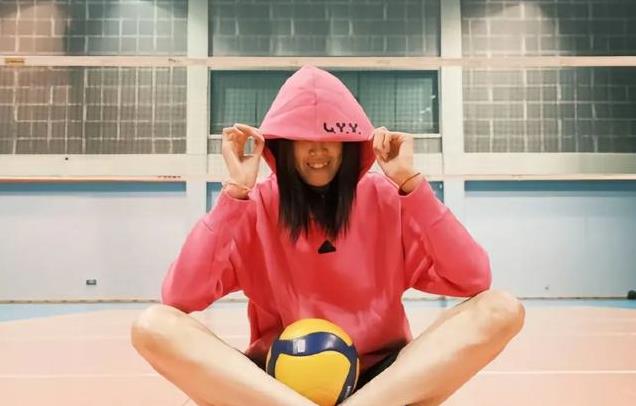 小李队长李盈莹站在训练馆内,单手拿着排球放在身侧,穿着最爱的粉色帽衫,带上帽子酷酷的,左手伸出大拇指力争第一,为天津女排点赞!