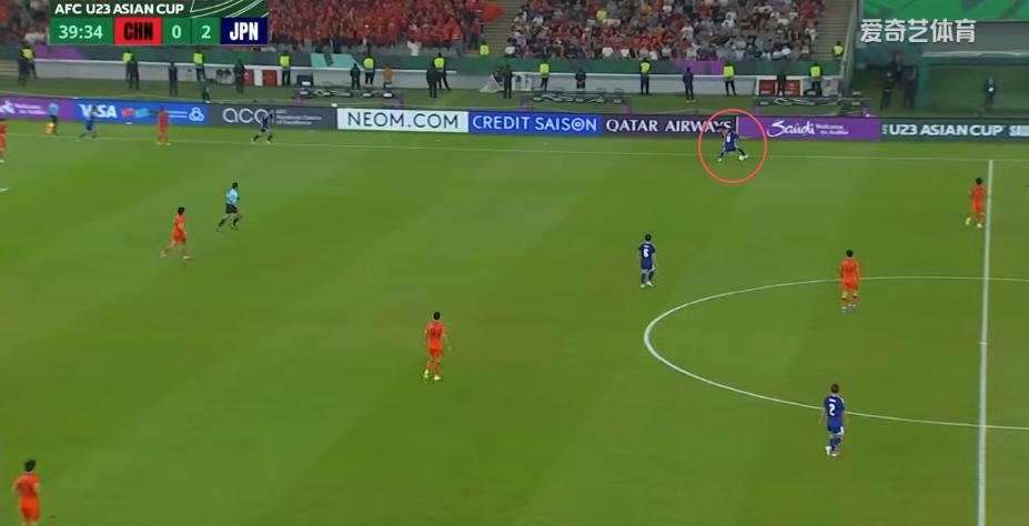 39分28秒,刘浩帆出球之前,日本U23前场正在形成高位压迫,这个时候,右前卫20号古⾕柊介在刘浩帆的正前方,10号佐藤龙之介在他左边,即我方大禁区点球点附近,左路边线处,胡荷韬正在回撤接应,而屏幕最右侧的大关友翔一直在盯防李镇全。