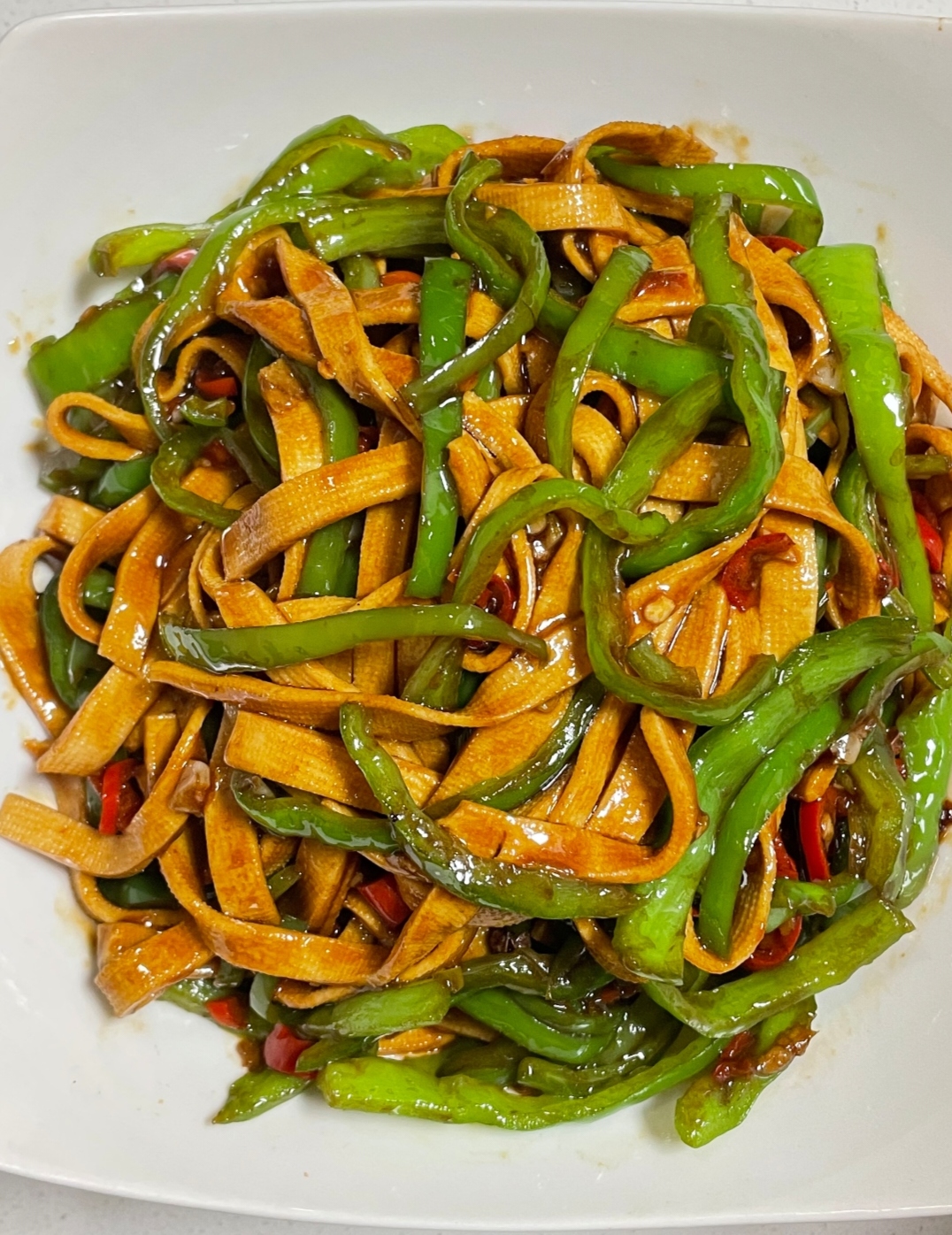 盛盘的时候,翠绿的青椒、金黄的千张,再配上星星点点的小米椒红圈,光是颜值就让人食欲大开。夹一筷子送进嘴里,千张吸饱了酱汁,咸鲜带劲儿,咬一口豆香四溢;青椒保持着脆爽,清甜微辣;偶尔咬到一粒花椒碎,麻酥酥的感觉在舌尖跳舞,简直绝了!