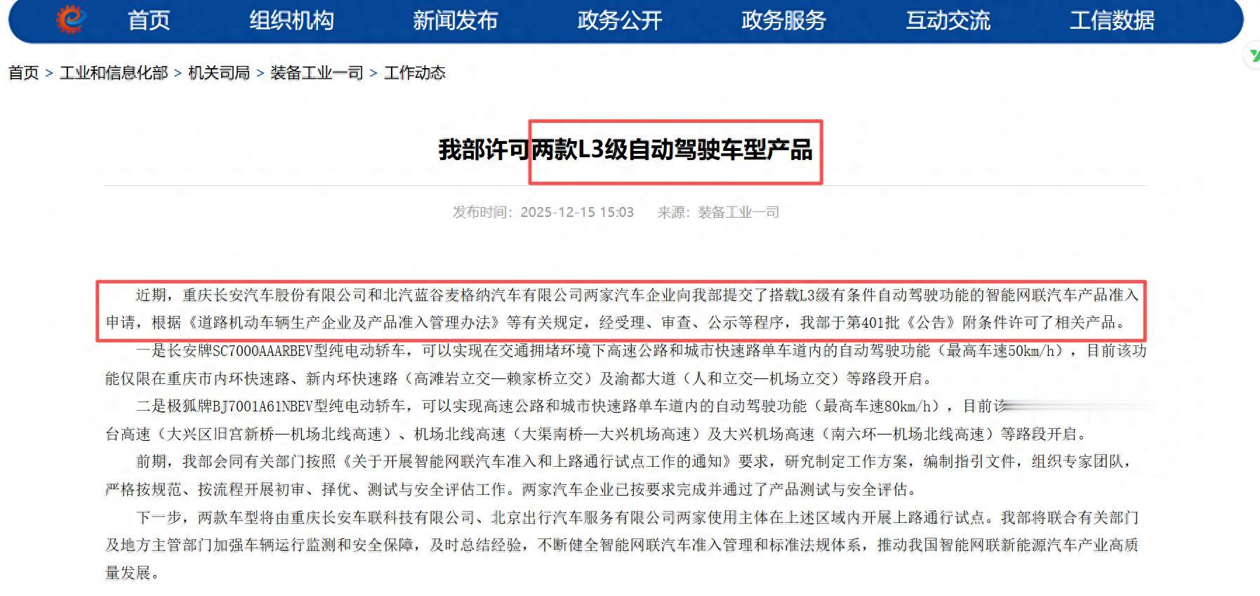 L3级别自动驾驶车型正式上线!根据工信部消息,两款分别适配城市拥堵、高速路段的车型将在北京、重庆指定区域开展上路试点!这意味着我们将正式进入L3级自动驾驶商业化应用。