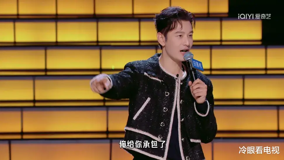 在单口喜剧表演中,豁出去了的黄晓明疯狂玩自己的梗,从古早的“闹太套”,再到乡村总裁情话,金句接二连三: