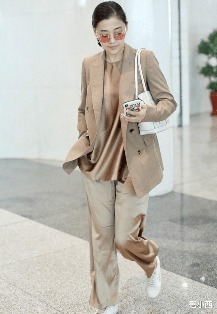 卡其色,源自朴实的大地色系,虽然平和,却散发着淡然的高级感,非常显气质。梅婷身上的这件卡其色西装套装可以看出面料是非常柔和的,下半身的裤子垂感很好,不管是日常上班还是逛街出门都很OK。