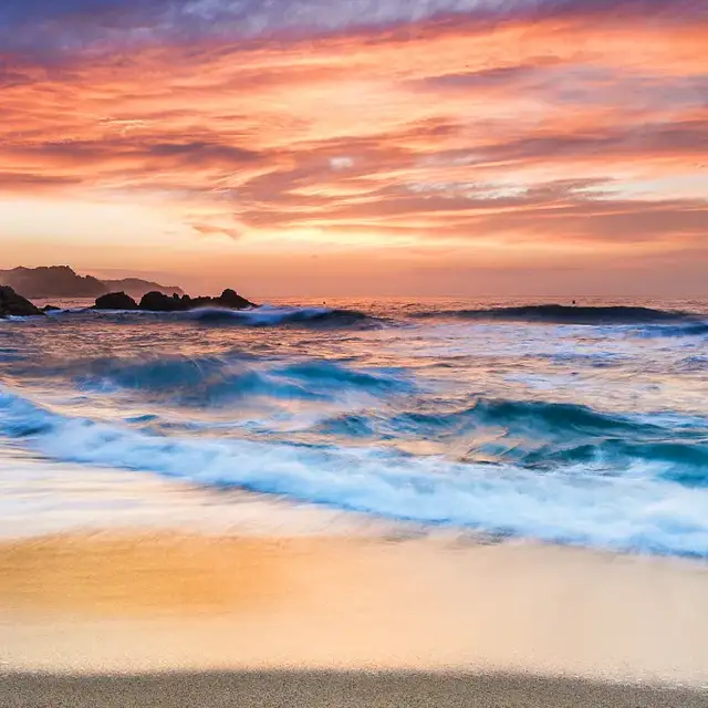2.傍晚日落时分:金色的阳光洒在海面上,波光粼粼,海面的色彩更加深邃迷人。