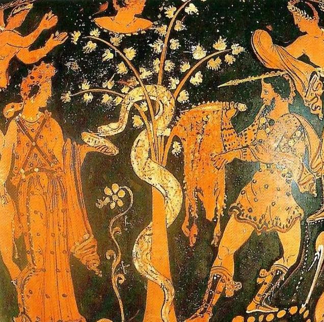 双耳喷口陶杯上的绘画《盗取金羊毛》(前4世纪),图中美狄亚正用药酒喂食巨龙,伊阿宋手持短剑割取金羊毛