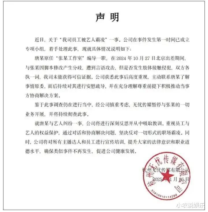 这家传媒公司于1月26日迅速发布声明,宣布与张某暂停所有业务合作。