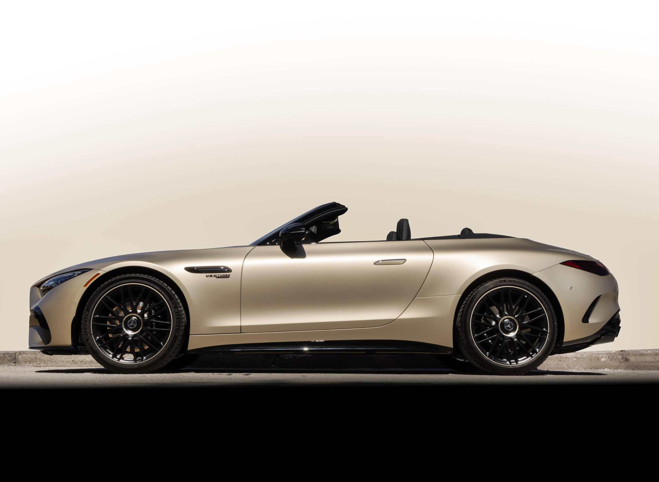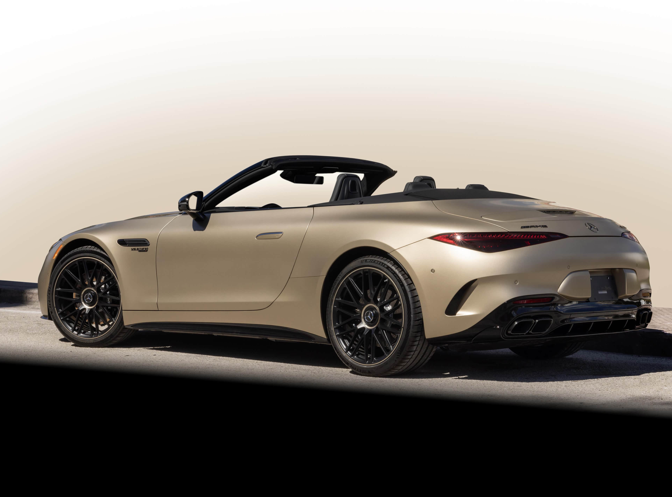 来到车身侧面,梅赛德斯奔驰AMG SL采用了GT跑车的设计风格,修车的发动机舱和后移的座舱,再加上双门黑色软顶敞篷车身的设计,并配备了双五辐式的锻造轮圈,前轮配备了265/35 R20、后轮配备了325/30 R21规格的米其林Pilot Sport 4S高性能轮胎,并配备了15.4英寸的双片式刹车盘(前轮)、14.2英寸大的刹车盘(后轮)和前六后四活塞刹车卡钳,带来了最直观的视觉冲击力。车身的长宽高为4704*1915*1359mm,轴距为2700mm,车内采用了2+2式的座椅布局,前包围新增了主动式进气口格栅,可以自动调节进气量,电动后扰流板增加了5种新的角度。