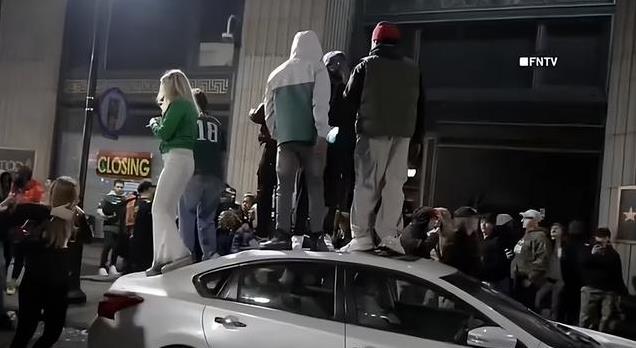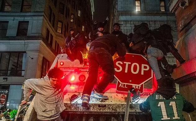 据英媒2月10日报道,当晚的欢庆因球迷的疯狂行为,使整个费城的街头陷入了无序状态。人们从四面八方涌向街头,开始跳上汽车、爬上垃圾车、公交站台,甚至攀爬交通信号灯杆。