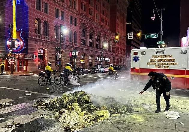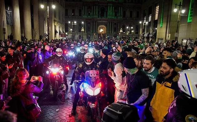 据悉,费城警方早已部署了大批警力,包括步行巡逻、摩托车队和骑警队,并在市政厅前整齐列队试图维持秩序,但显然,面对数量庞大、情绪高涨的球迷,他们显得有些力不从心。