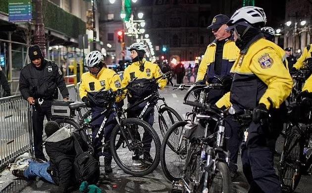 百老街与栗子街交界处,一群球迷还在试图掀翻警车,而在附近的梅西百货门口,另一批球迷则直接拆下了两组交通信号灯,并将它们砸成碎片。