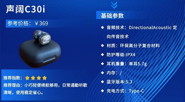 推荐理由:声阔C30i定位入门级高性价比蓝牙耳机,主打基础实用与稳定续航,面向学生、上班族等日常用户,凭借清晰音质、简单操作与亲民价格,成为入门级耳机的优选,满足听歌、通话、追剧等核心需求。