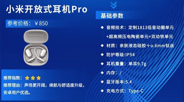 推荐理由:小米开放式耳机Pro定位高端开放式运动耳机,在基础款上升级音质与续航,专为追求高品质体验的运动、通勤人群设计,凭借高清音质、强悍续航与全能性能,成为小米生态用户的高端优选。