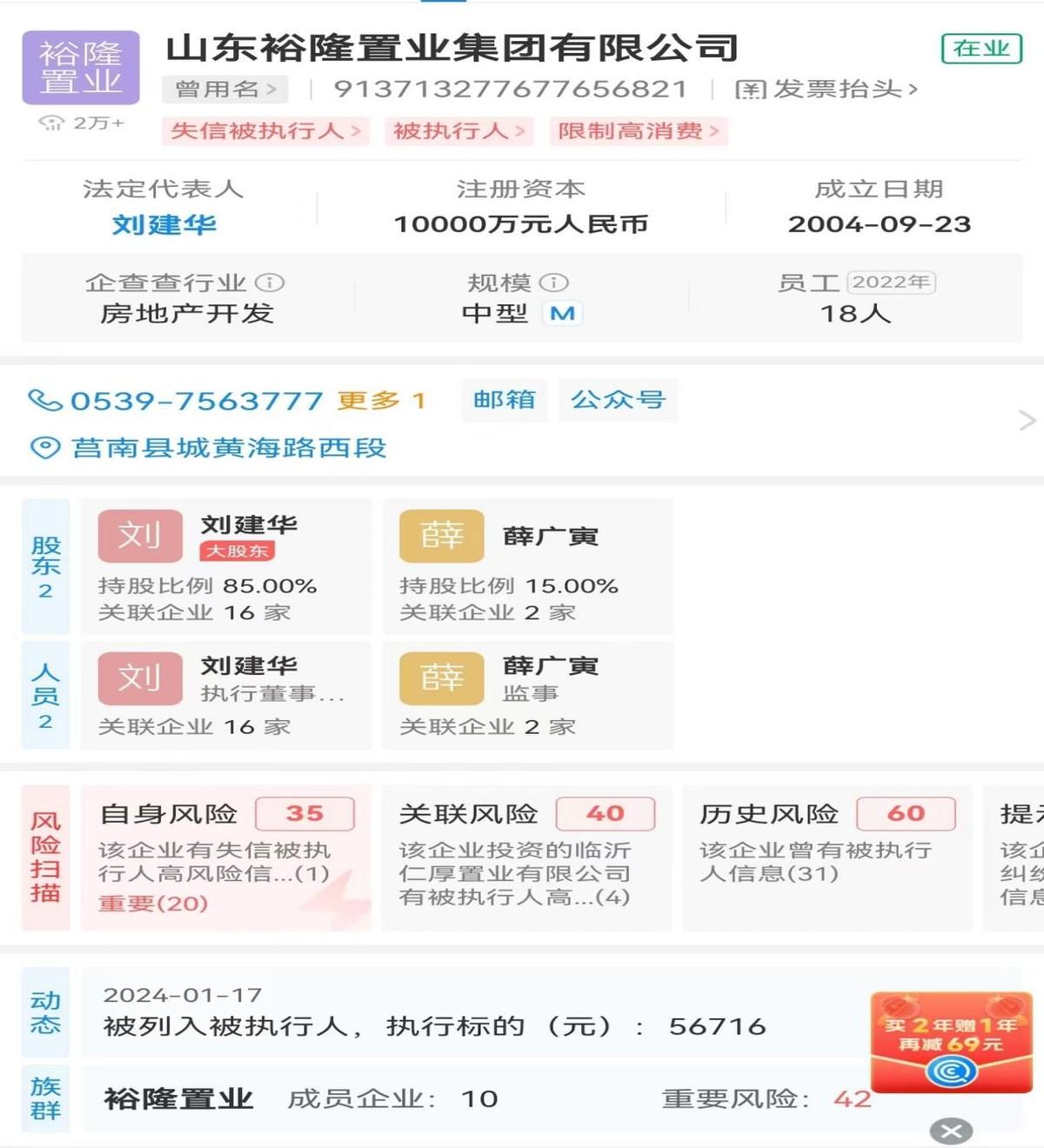 据悉:莒南县裕隆置业集团涉及房地产开发、商砼等多个实体经济领域。也是莒南县“老牌”企业。按道理来讲应该资金实力雄厚、诚实守信才对。企查查显示:目前该公司已经例入:失信被执行人;被执行人;限制高消费。已出现自身风险35条;关联风险40条;提示信息达100余条;司法案件100余期起;合同违约10起——