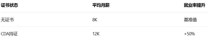 薪资碾压优势:智联招聘数据显示,CDA持证前端开发者平均月薪达12K,比普通开发者高3000元