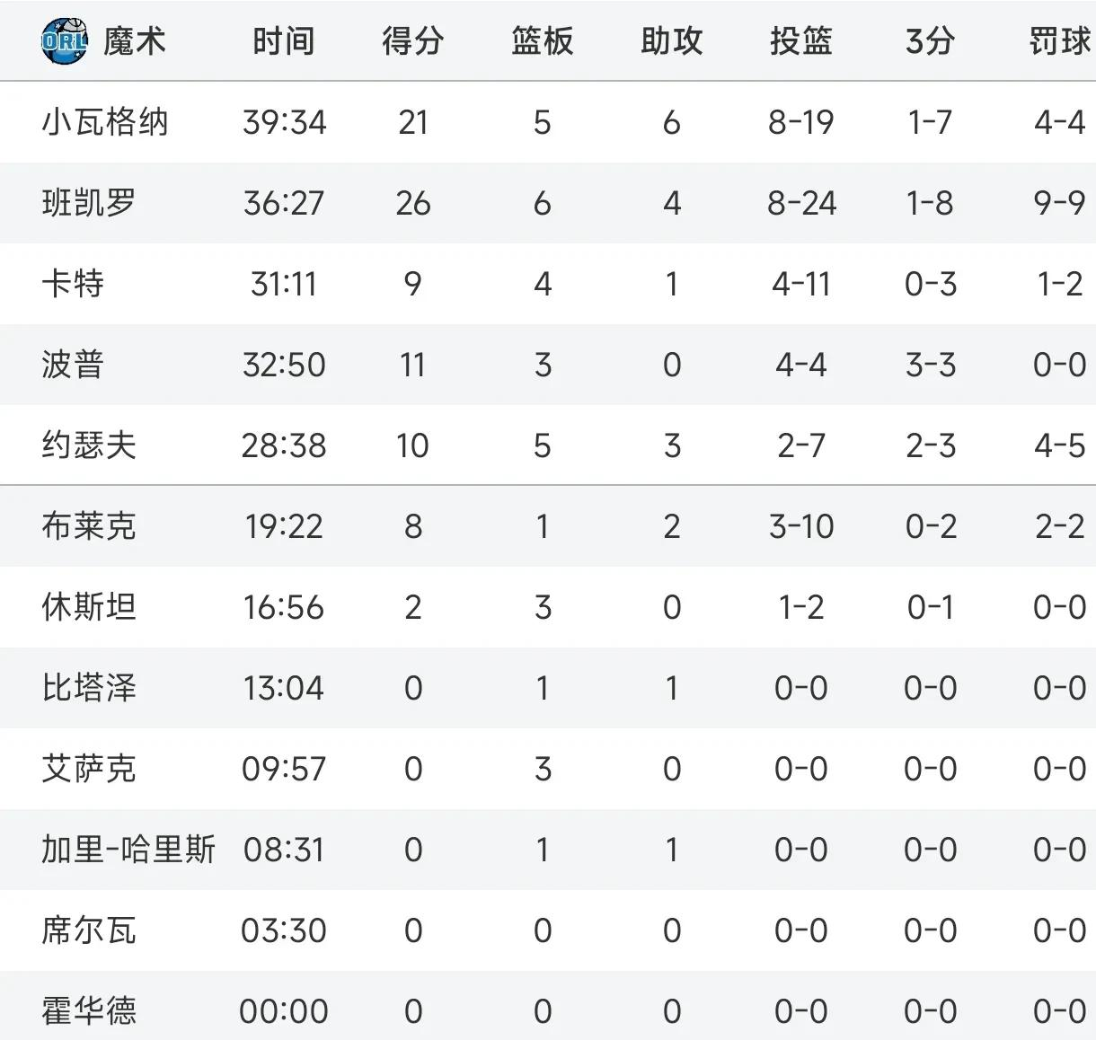 魔术方面,班凯罗拿到26分,球队数据如下。