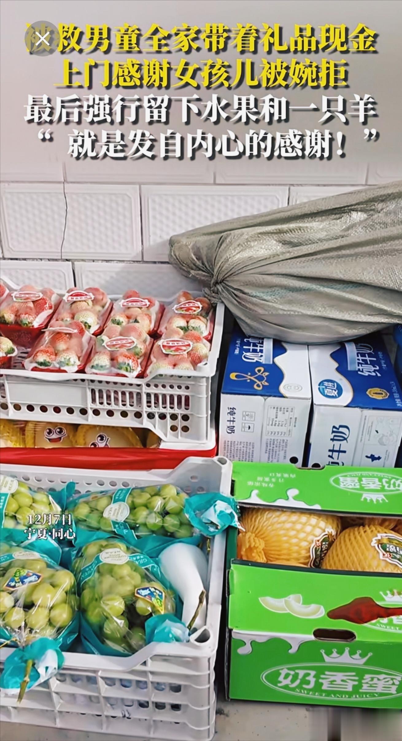 被救男孩的父母提着水果、抱着小羊羔、拿着红包来感谢,她和家人只收下了情谊,把红包退了回去。她说,不该收钱。男童父亲说:就是出自于内心的一种感谢。被救男孩的妈妈第一时间和她拥抱,紧握双手并留下了眼泪。