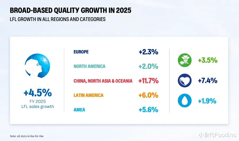 小食代留意到,在中国、北亚及大洋洲地区(CNAO),2025年全年,饮用水和饮料业务的销售收入增长6.1%至7.77亿欧元,其中在第四季度,该业务销售收入为8100万欧元,和去年大致持平(增长0.1%);该地区专业特殊营养业务2025年收入为27.68亿欧元,同比增长13.2%;其中在第四季度为7.21亿欧元,增长10.4%。