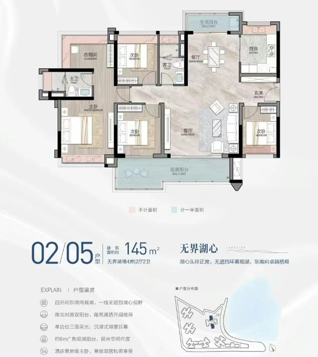 145平方米四室两卫:该户型拥有宽敞的客厅和阳台,适合家庭聚会和休闲。大面积的窗户设计让居住者可以尽情欣赏湖景,享受生活的每一刻。