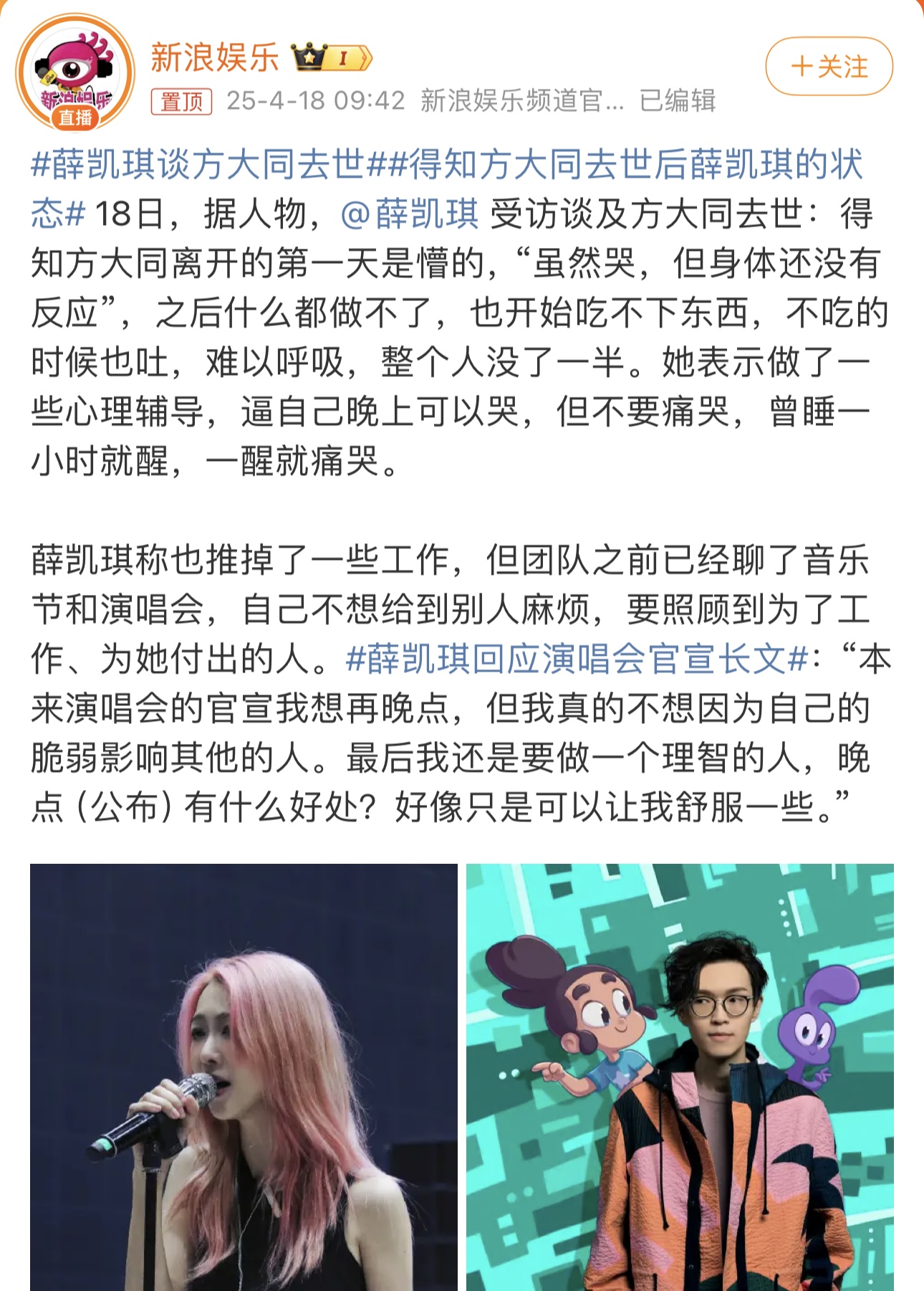 一开始听到方大同离开的消息,薛凯琪直接进入“懵圈”状态,用她自己的话说就是“虽然哭,但身体还没有反应”。这感觉就像是被一记闷棍敲了一下,大脑一时半会儿还没转过弯来。估计当时她心里在想:“这咋可能呢?我是不是听错啦?”