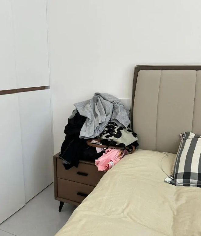与进门脱下来的衣服一样,睡前脱下来的衣服同样需要一块收纳区。否则,床上、床头柜上、飘窗上就会堆满各种衣服。