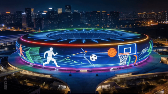 四是场馆外立面靓化,结合建筑Mapping技术,在体育场馆外立面打造光影秀,将体育元素、城市文化与建筑形态深度融合,成为城市夜间景观的重要组成部分,助力城市夜间经济升级,也让体育场馆成为城市标志性的“靓化”景观。