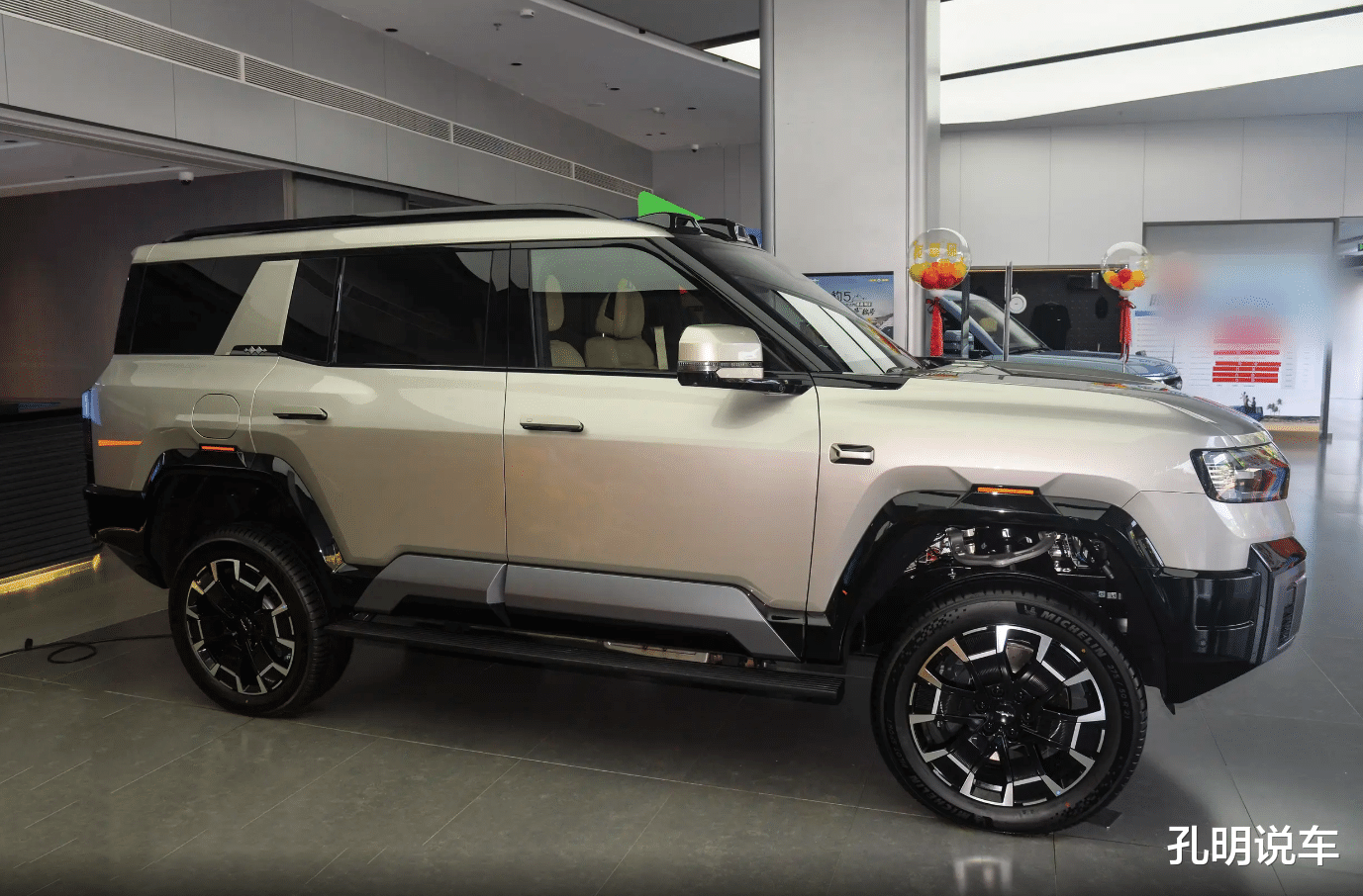 外观造型设计还是继承了之前比亚迪方程豹豹5那套经典的风格,车头前脸方方正正,硬派效果是比较到位的。而得益于更大的车身尺寸,从侧面看确实就比方程豹豹5气场明显更足,而且在车身C柱位置营造了倾斜的车窗立柱效果,更容易辨认,尾部当然还是凸显硬派的全尺寸备胎小书包。