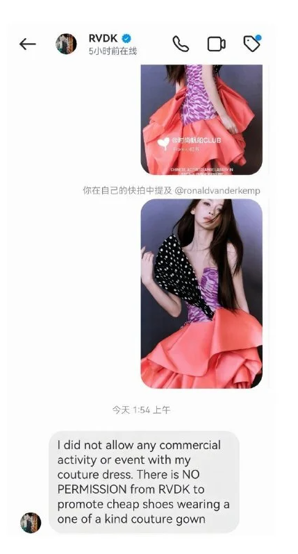 设计师的表态干脆又强硬,态度毫不含糊:“这款高定的授权范围只限于红毯、晚宴等正式场合,我从没允许任何人拿去直播带货,更接受不了用高定搭配廉价鞋子做商业化营销。” 他还补充道,这款礼服的设计初衷是传递时尚美学,而非用来衬托平价商品,言外之意直指AB团队要么擅自扩大使用场景,要么压根没拿到正规授权,字里行间满是对作品被“滥用”的不满。