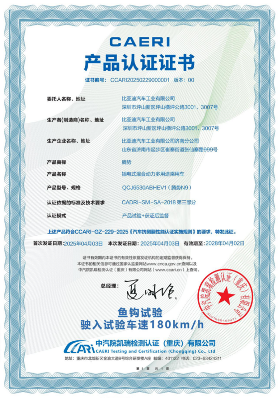 近日,腾势N9在中国汽研的鱼钩测试中,以惊人的180km/h时速刷新了世界纪录,成为国内首款通过该权威测试认证的车型,展现了其无与伦比的安全性能。鱼钩测试,被誉为“死亡弯道”,是模拟高速避障紧急转向工况的严苛测试。腾势N9凭借三大安全配置:易三方整车智能控制技术平台、云辇-A智能空气车身控制系统以及强悍的CTB车身一体化结构,成功征服了这一“终极大考”。不仅如此,腾势N9在麋鹿测试、高速爆胎测试以及AEB测试中,同样表现非凡,创造了多项全球纪录,腾势N9安全大满贯的荣誉实至名归。腾势N9用实力证明,中国新能源汽车已经站在了世界安全技术的巅峰。它不仅是家庭的出行守护者,更是中国新能源汽车安全的骄傲!