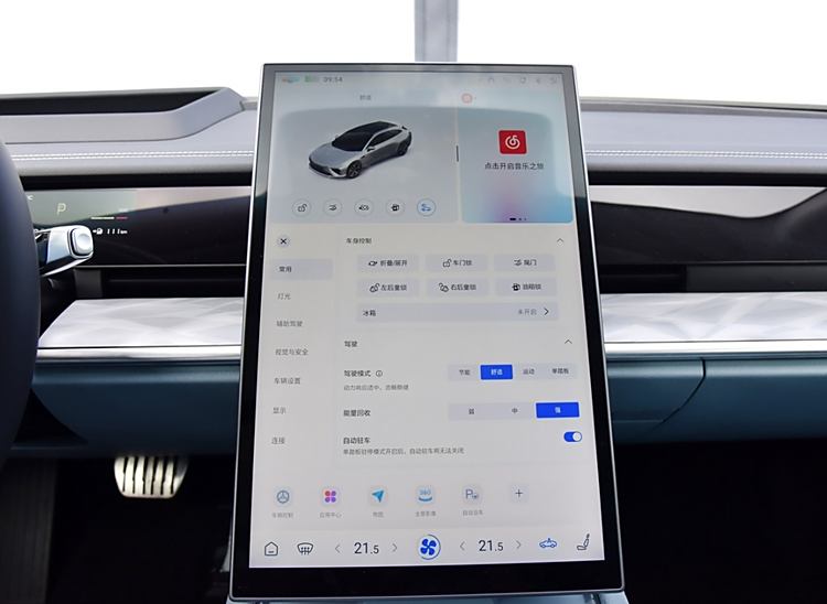 来到车内,哪吒S猎装版中控采用对称设计,左侧三幅式平底方向盘和哪吒S基本一致,三九点位置采用按键和旋钮组合的控制方式,方向盘后方是内置窄条液晶仪表。中控中央放置着竖向布局的17.6英寸2.5K超清中控屏,内置高通骁龙8155P芯片。