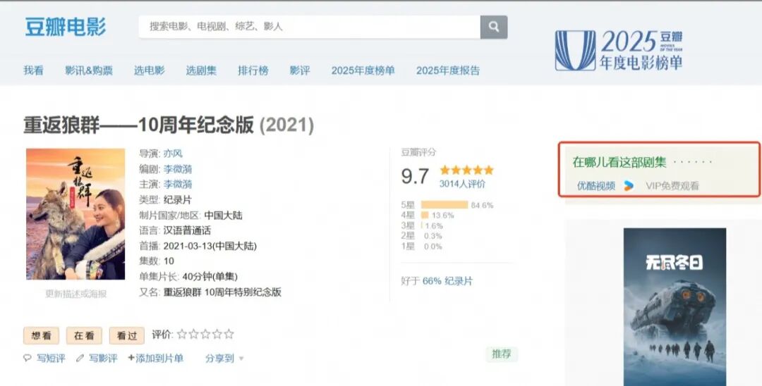 2017年,电影《重返·狼群》上映;2021年,《重返狼群10周年纪念版》纪录片在优酷独家上线,更完整地补充了很多电影没来得及讲述的内容素材。如今纪录片翻红,不少新的观众纷纷来优酷站内观看这部老片。今年1月中旬,《重返狼群10周年纪念版》纪录片的第11、12集重新在优酷“满血上线”,这是目前全网唯一的纪录片完整版。