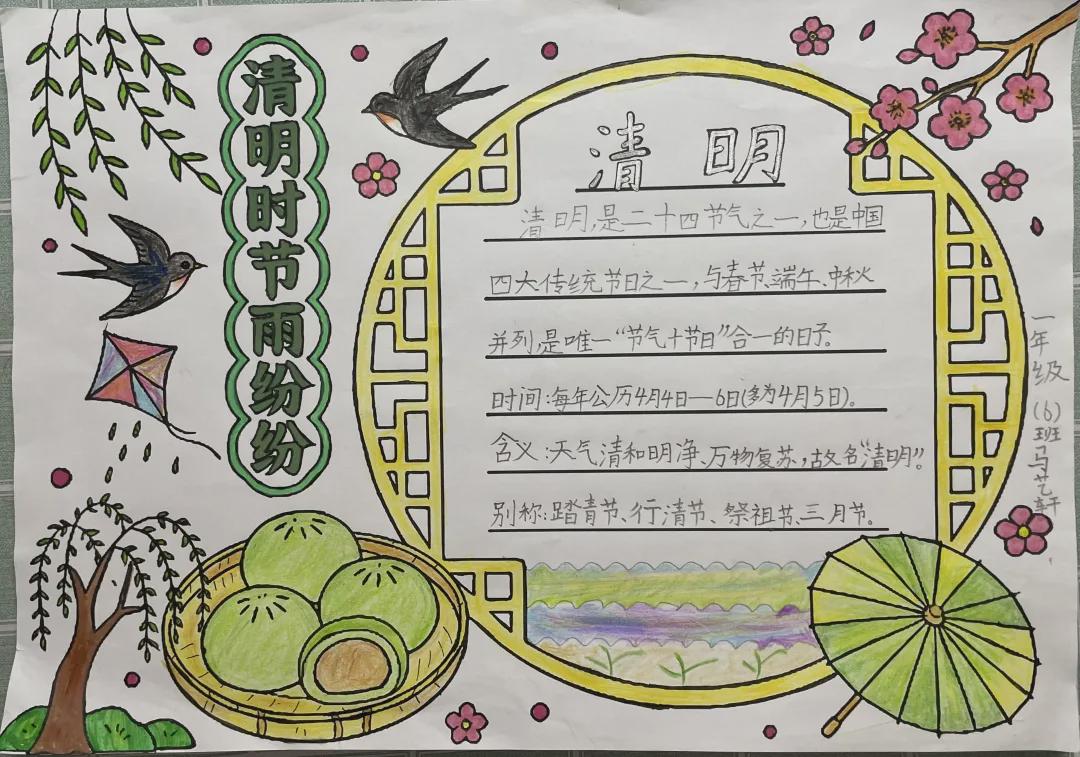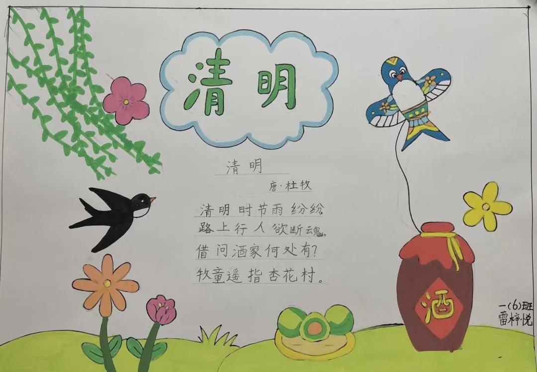 立志向,有梦想。同学们主动查阅清明习俗、节气由来、英烈事迹等相关资料,用工整的文字书写清明诗词与节日感悟,用细腻的画笔描绘踏青、美食、放风筝等清明场景,将对传统文化的热爱融入笔墨之间,五彩斑斓的作品里满是童趣与古今融合的新意。