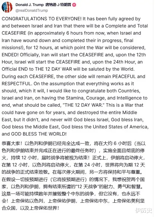 不是小伊我看不明白,确实是这世界太魔幻了。一觉醒来,特朗普突然发表炸裂推文:伊朗和以色列已经同意分阶段彻底结束这场“持续12天的战争”。特朗普甚至贴心地公布了方案细节:停火将于美国东部时间24日零时,也就是他发文6小时后开始。第一阶段,伊朗先停火12小时;第二阶段,以色列再停火12小时。24小时后,战争正式结束。特朗普还自信地补充说,在每一阶段的停火期内,另一方都将“保持和平与尊重”,以完成各自的“最后任务”。