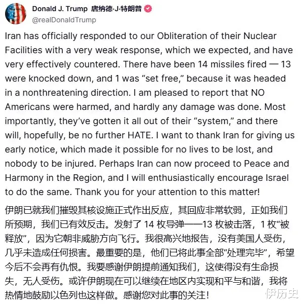 特朗普在推文中说,感谢伊朗在导弹袭击前提前通知了美方,所以基地人员早已撤离,未造成任何伤亡。14枚导弹中有13枚被成功拦截,剩下那1枚没拦截,是因为伊朗自己打偏了,对基地根本不构成任何威胁。还说伊朗对美国摧毁伊朗核设施行动的回应非常软弱