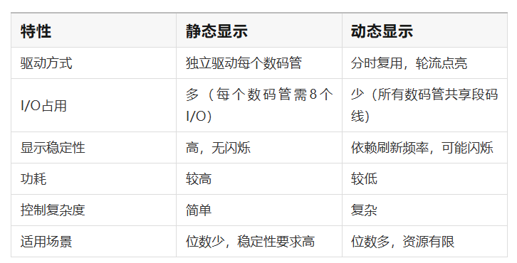 为了更直观地理解静态显示的特点,我们将其与动态显示进行对比: