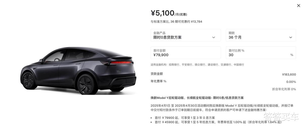 根据此项购车方案,购买新款Model Y后轮驱动版,3年0息方案的首付金额仅需7.99万元,月供5100元;选择5年低息方案首付金额仅需4.59万元,月供3809元。