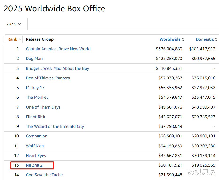 北美的这个票房数据统计网站,所统计的都是影片的全球票房成绩,而《哪吒2》在其中却只有3000多万美元,算下来就是他们并没有把我们中国内地的票房算进去。