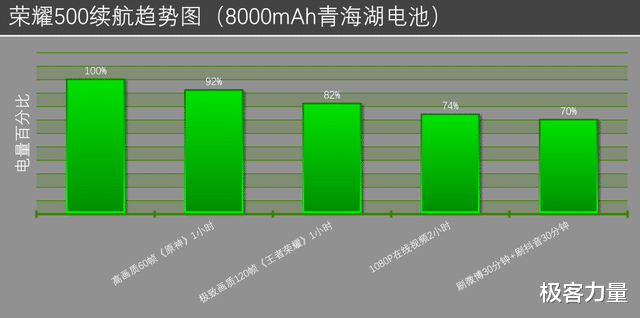 说到续航,这可能是荣耀500最让我惊喜的地方。8000mAh的青海湖长续航电池,你没看错,就是这个数字。配合荣耀的AI都江堰电源管理系统及HONOR E2能效增强芯片,我这重度使用者居然能撑差不多两天。经测试从 100% 到70%的电量,我不仅玩了一个小时的原神、一个小时王者荣耀、两个小时的视频,以及观看了30分钟的微博,最后还有刷了30分钟的抖音,从来不敢相信才掉了30%的电量,相信以前一天至少充两次电,有了荣耀500后我可以肆无忌惮的玩起来了,这8000mAh的大电池的安全感爆棚。