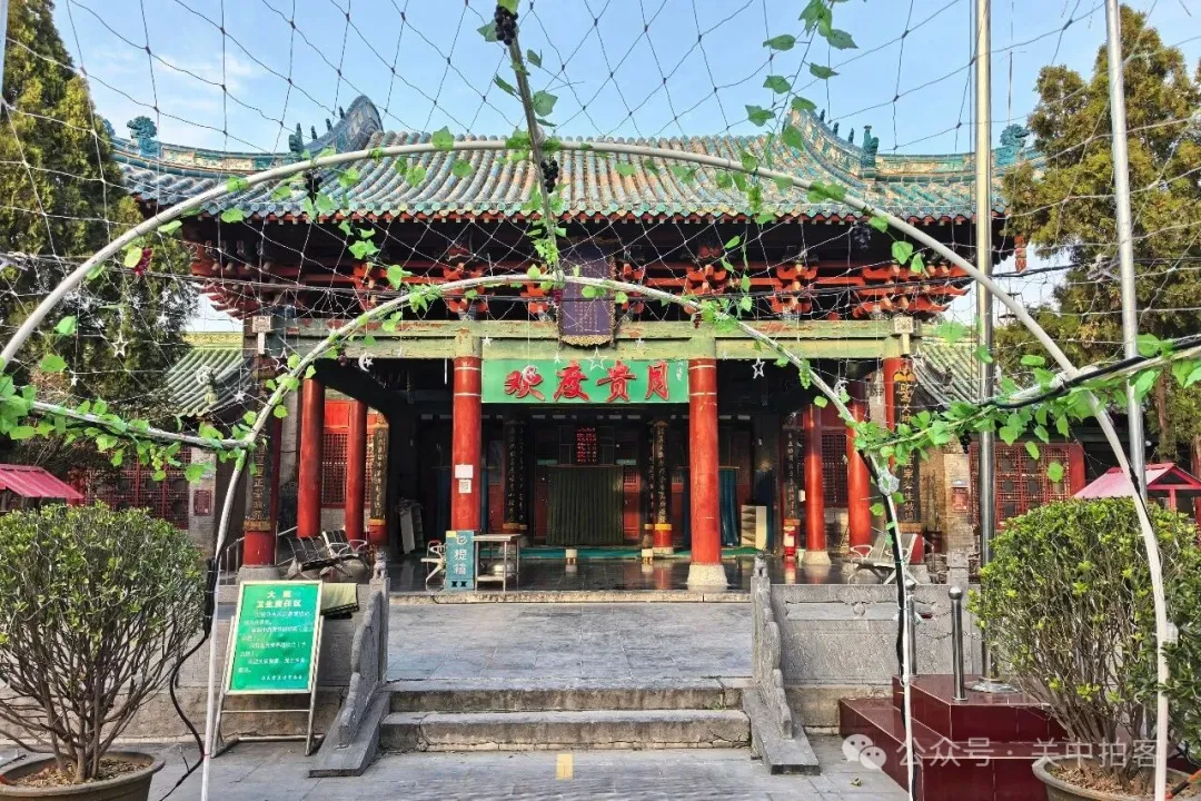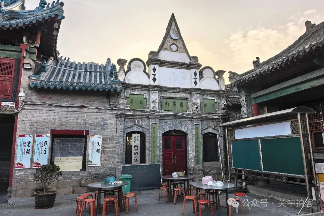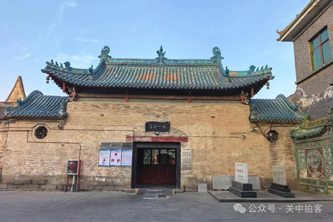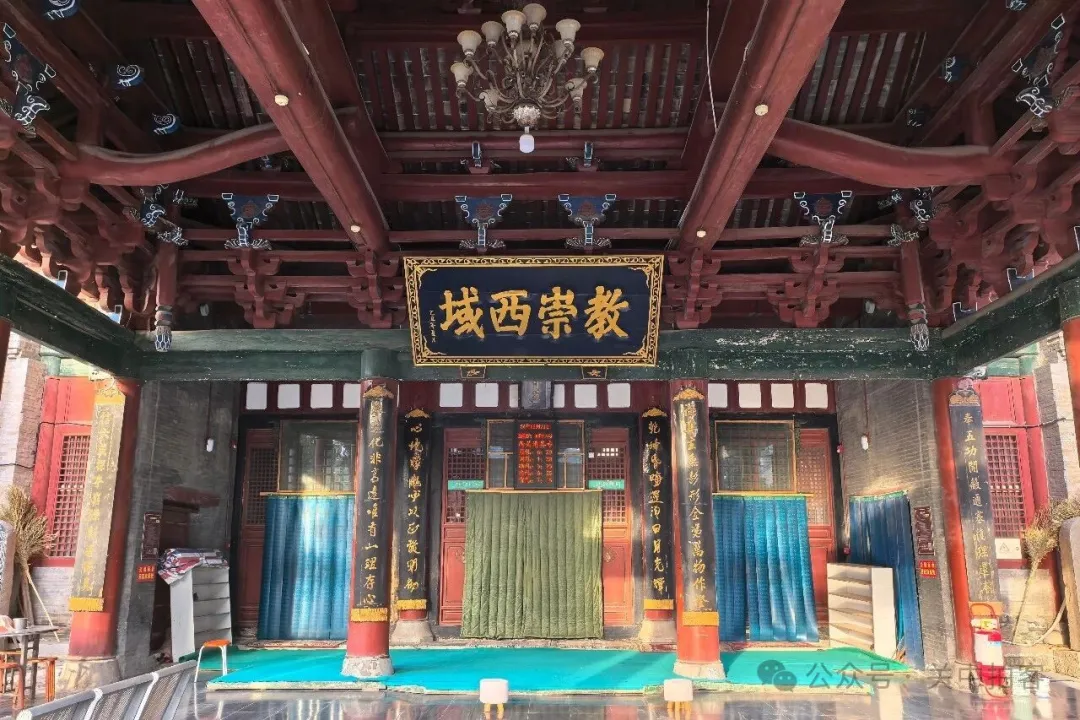 在清化街的中心,便是西关清真寺,路边新修建起一高一低两座仿古门楼。在较高的门楼上,悬挂着一块匾额,赫然写着“西关古教”四个篆书大字。穿过门楼,进入院内,在西侧砖砌的高墙之中,坐落着明清时期重修的西关清真寺建筑群。